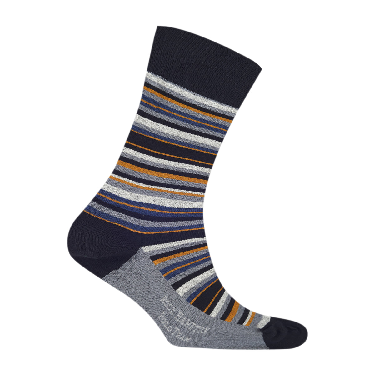 Calcetines para hombre. Complementa tu look con estos ligeros y cómodos calcetines color gris. Su diseño a rayas delgadas de colores, te darán ese toque moderno y casual.