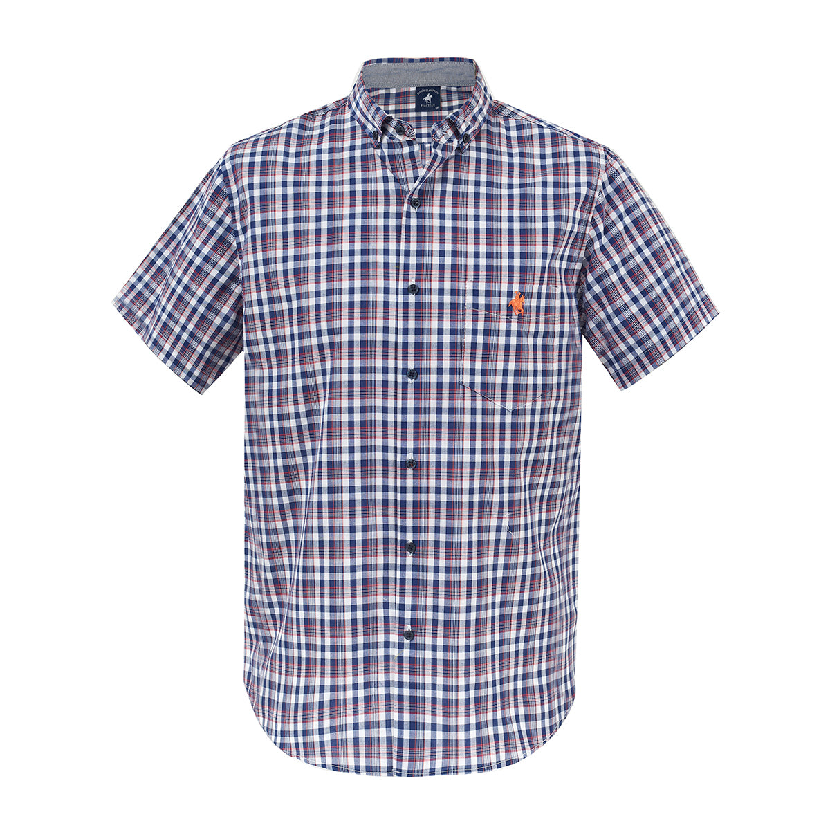 Camisa para caballero de manga corta a cuadros chicos color marino y blanco. Un diseño clásico, fresco y casual.