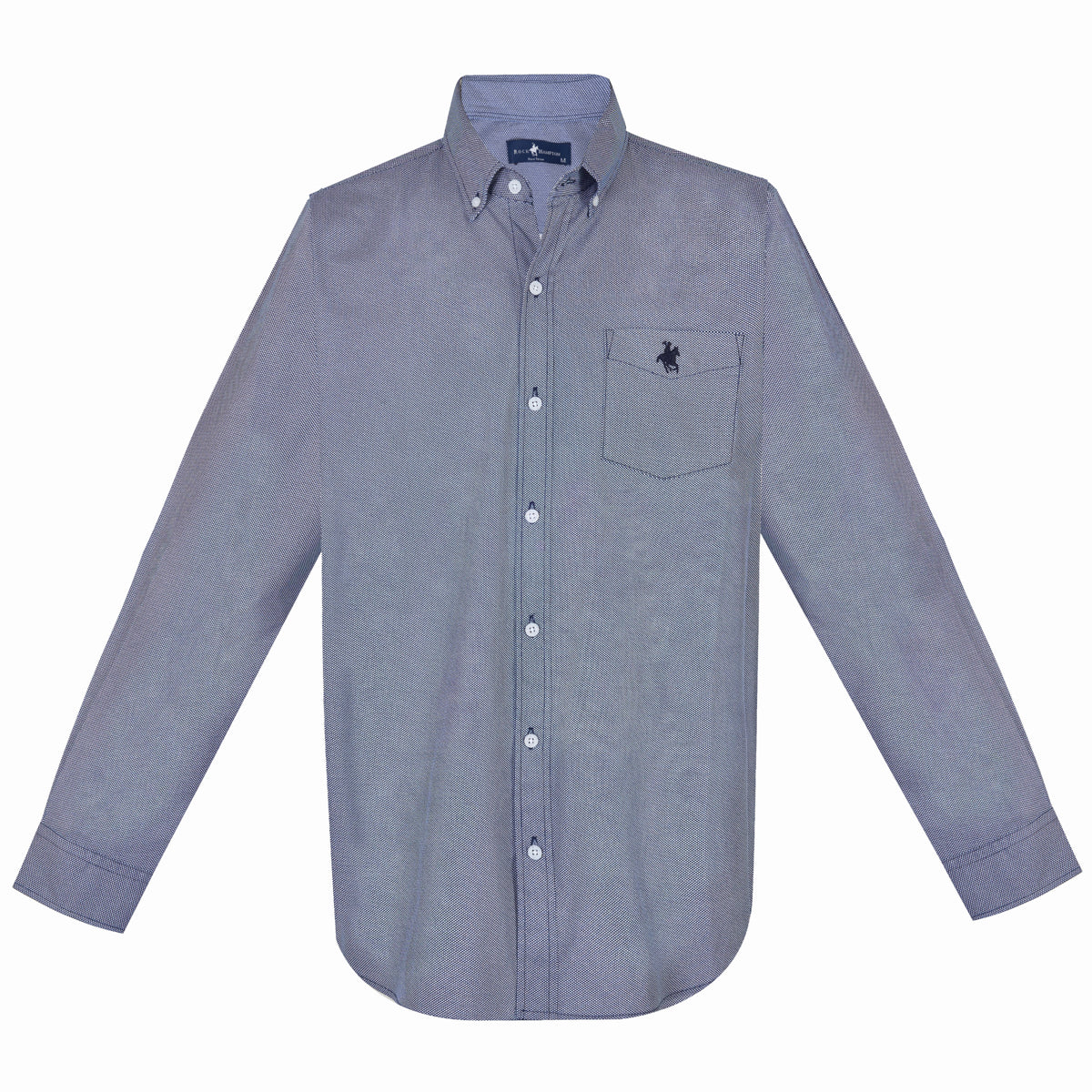 ¿Buscas una camisa que combine estilo clásico con un toque distintivo? ¡Esta es para ti! Imagina una camisa de caballero de manga larga, con el siempre elegante cuello button down, pero con un detalle que marca la diferencia: un delicado bordado de caballito en la bolsa frontal. Su malla en un profundo color marino le da un aire sofisticado y moderno a la vez.