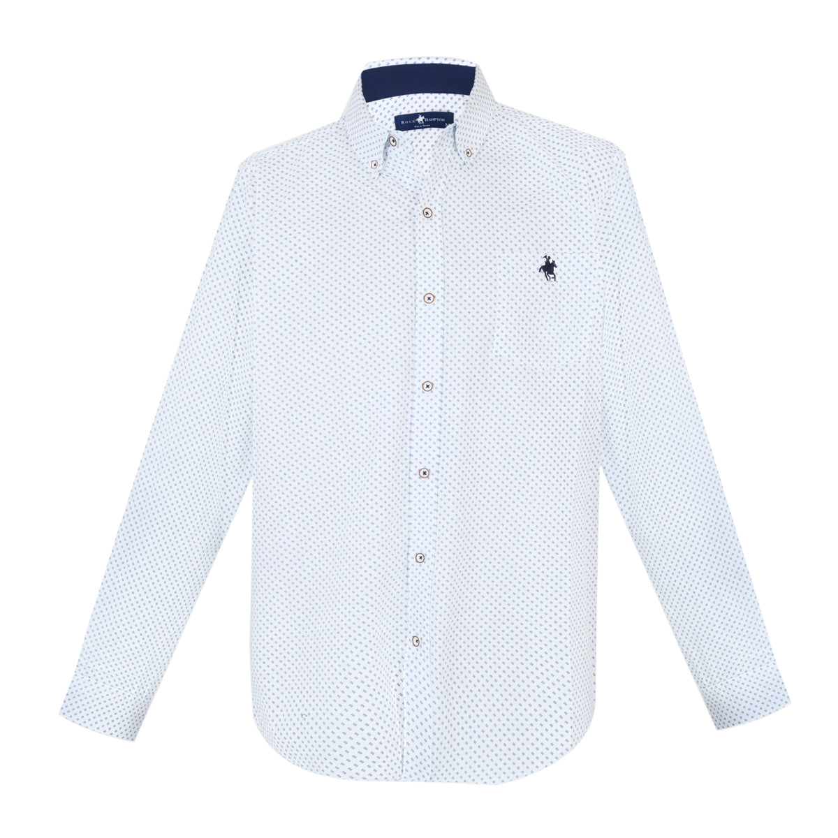 Descubre la combinación perfecta de estilo y comodidad. Esta camisa button down para caballero, en tela blanca con microdiseño y líneas en malla azul marino, es ideal para cualquier ocasión.