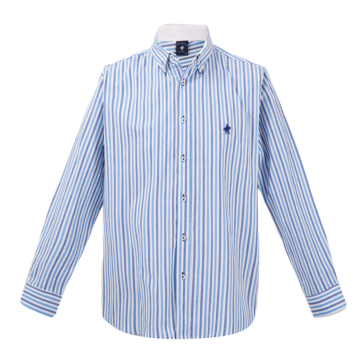 Camisa de manga larga para caballero, con textura a rayas color azul y gris, interior de puños y cuello en blanco. El clásico diseño casual y elegante.