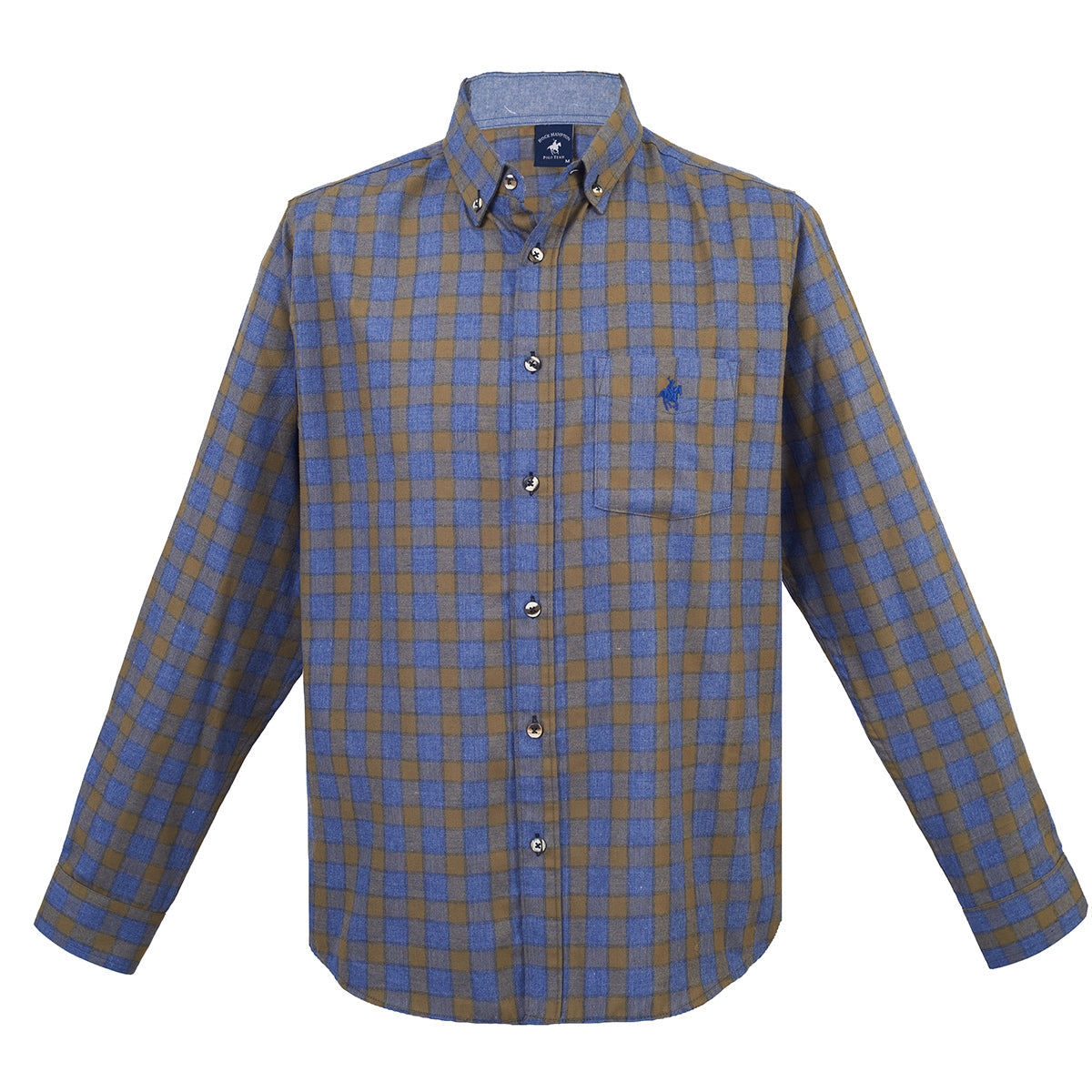 Camisa de manga larga para hombre, con textura en cuadros medianos color olivo y azul, interior de puños y cuello en azul. El clásico diseño casual y elegante.