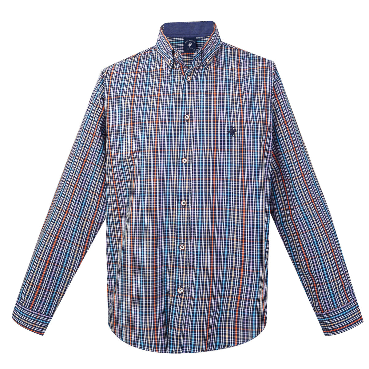 Camisa de manga larga para hombre, con textura de micro cuadros color marino, naranja y cielo, interior de puños y cuello en marino. El clásico diseño casual y elegante.
