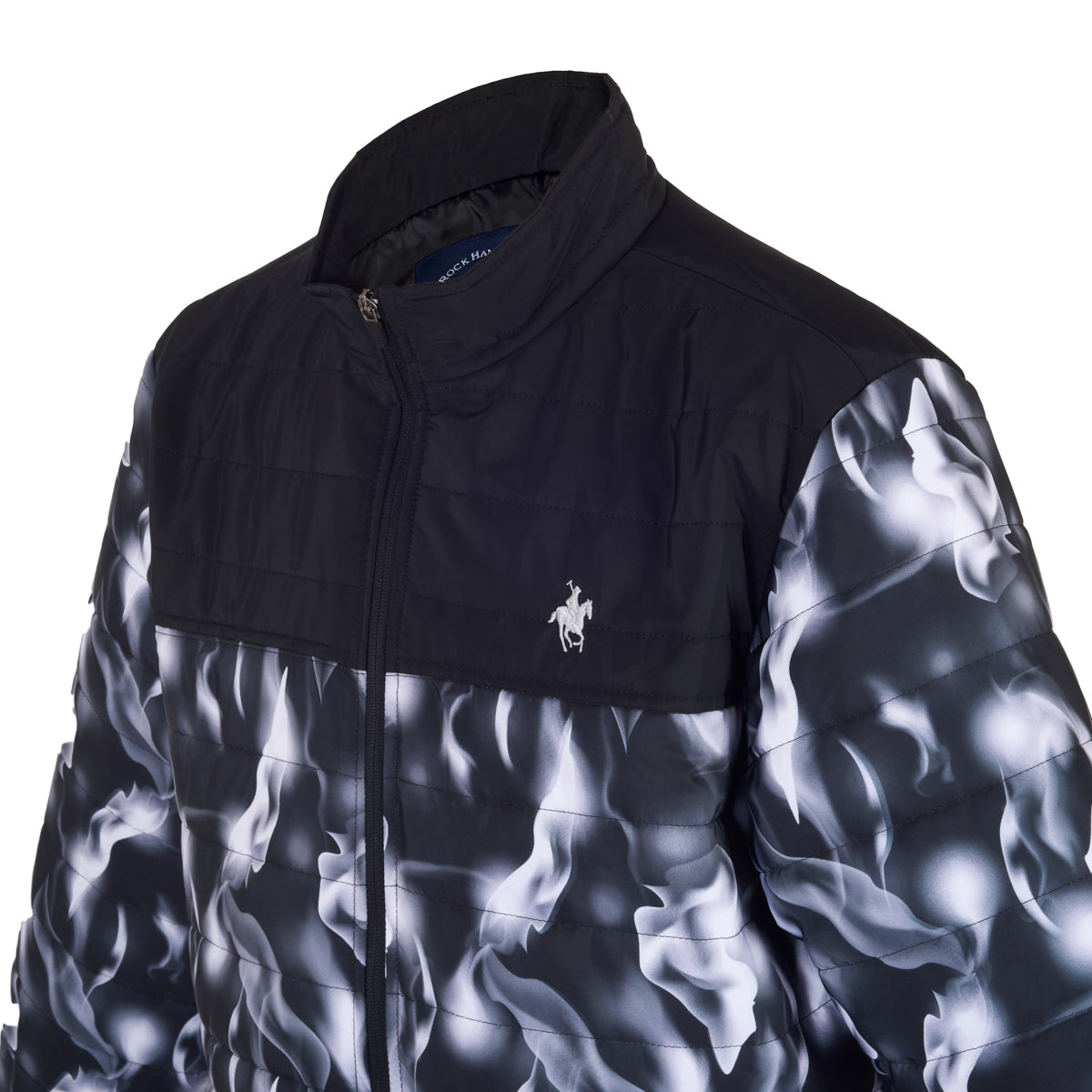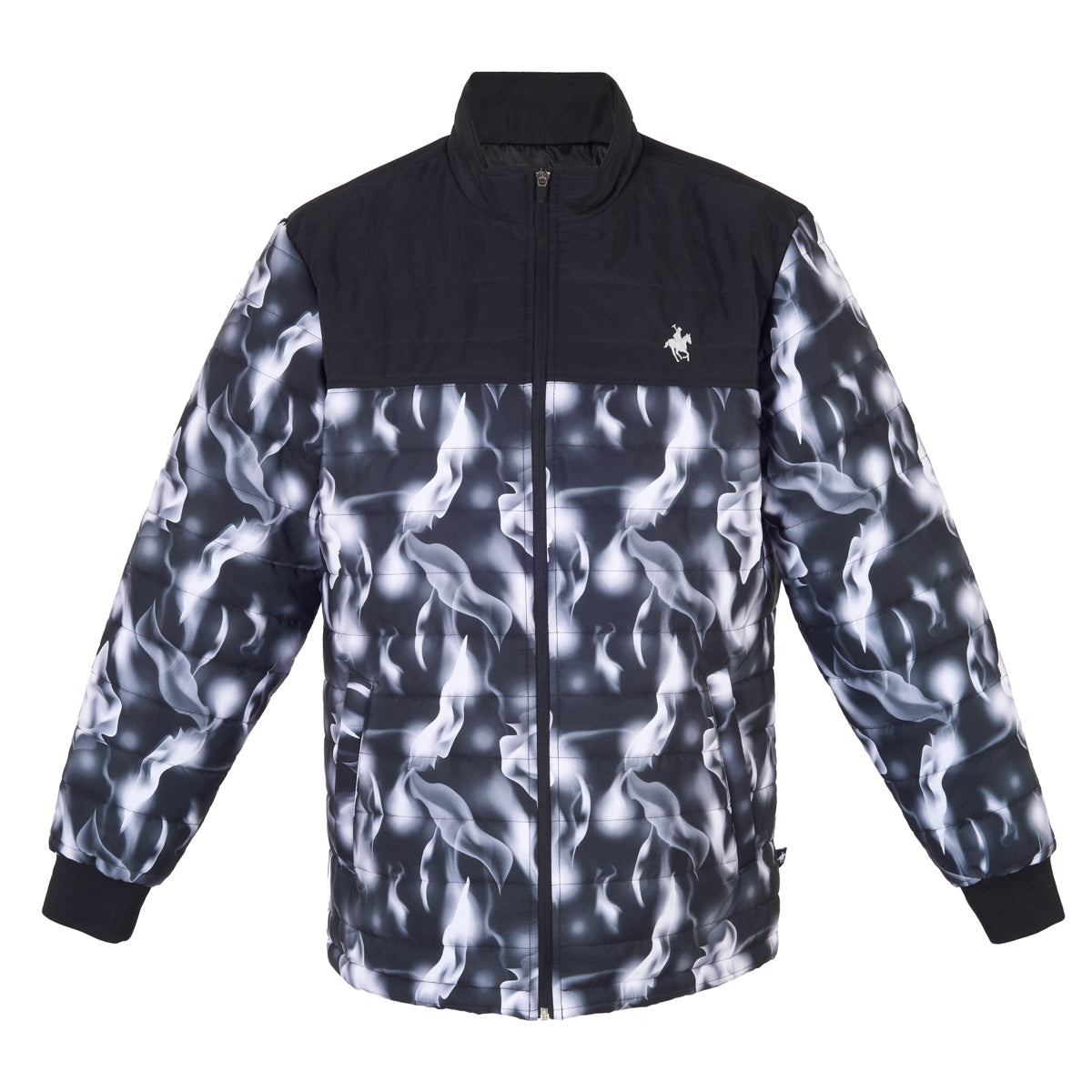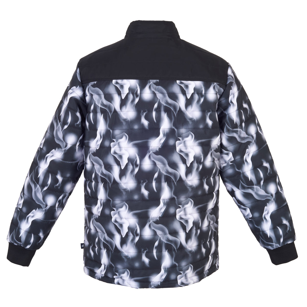 ¿Quieres una chamarra que te haga destacar con un estilo moderno y original? ¡Esta es para ti! Su capitonado horizontal le da una textura interesante, pero lo que realmente la hace especial es su diseño sublimado estilo humo. ¡Es como llevar una obra de arte sutil y moderna contigo!
