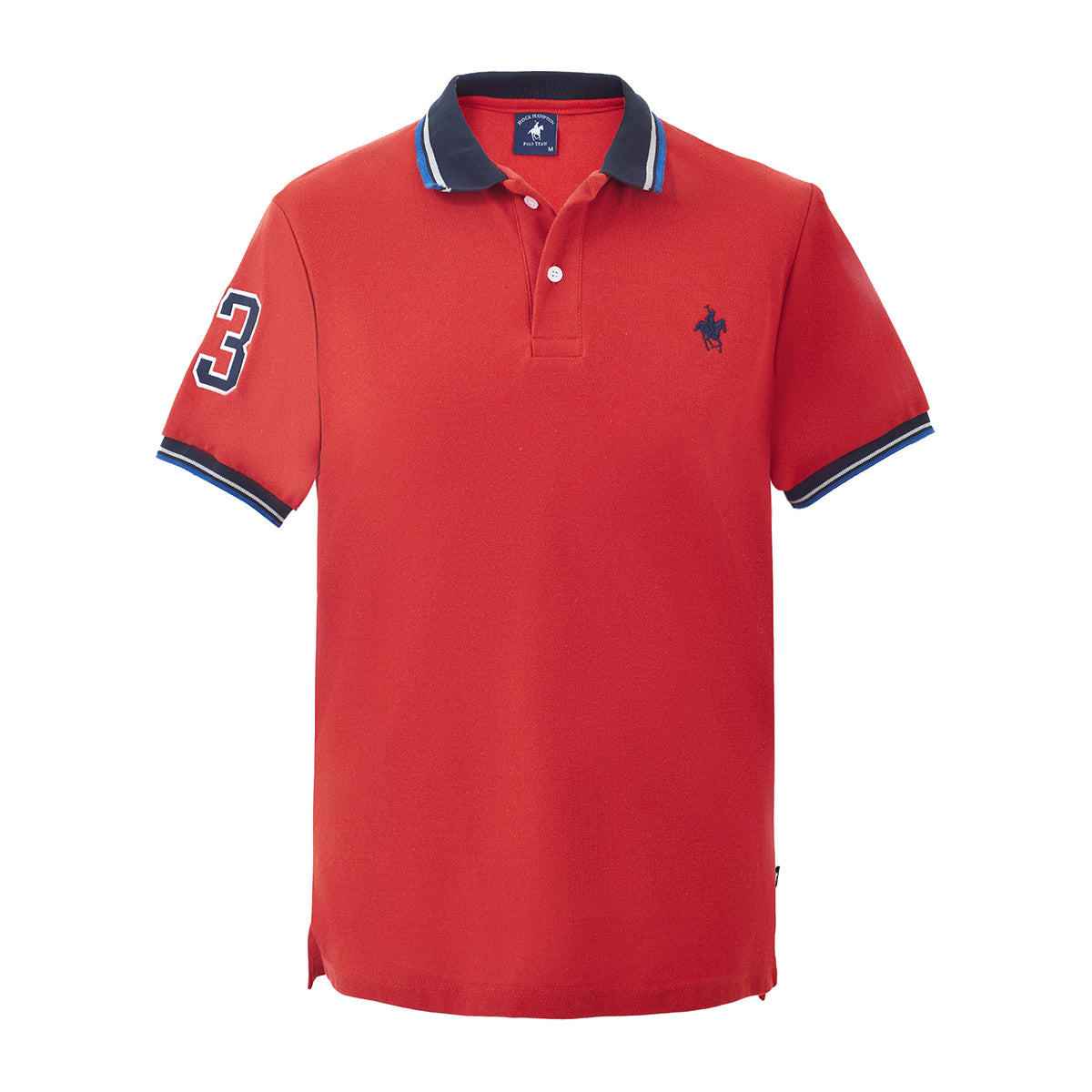 Playera Polo para caballero color ladrillo, con bordados en el pecho y número en la manga y franjas en cuello y puños. Nuestra clásica silueta atemporal, elegante y casual.