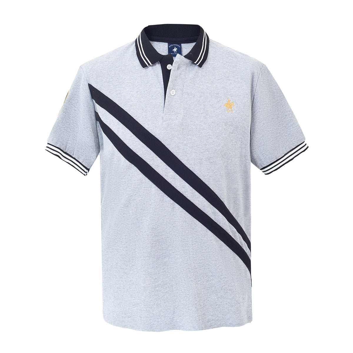 Playera Polo para caballero color gris, con franjas transversales en negro y bordado en manga y pecho. Nuestra clásica silueta atemporal, elegante y casual.